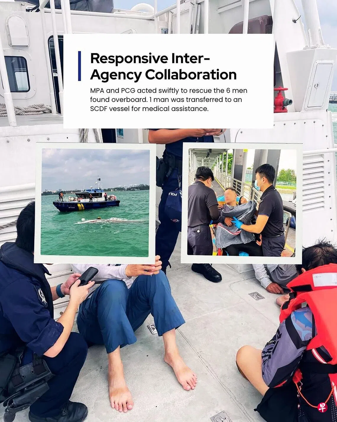 警察海岸卫队从沉没船只中救起六名落水者;其中一名落水男子当下被转移到新加坡民防部队的船只,由医护人员提供医疗协助。