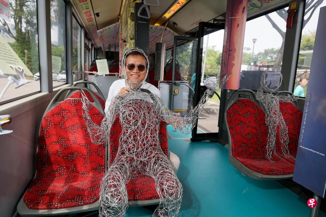艺术巴士车厢内,两个由金属线条构成的人形艺术装置,各自“坐”在不同座位上,与乘客并肩却不相连。分开坐的大人与小孩人形像,脸部留空,吸引乘客走近,把自己的脸“放进”轮廓中,与作品互动,形成有趣画面。