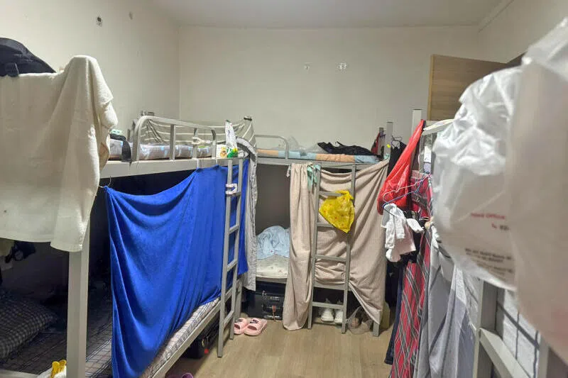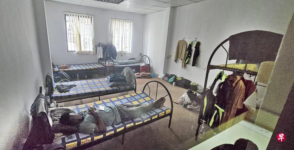 上到三楼时,林先生也发现其中一个房间有两个折好的床褥;另一个房间铺着床褥,还有人在睡觉;最后一个房间则有三个床褥,窗边还挂着一些女性衣服和内衣。