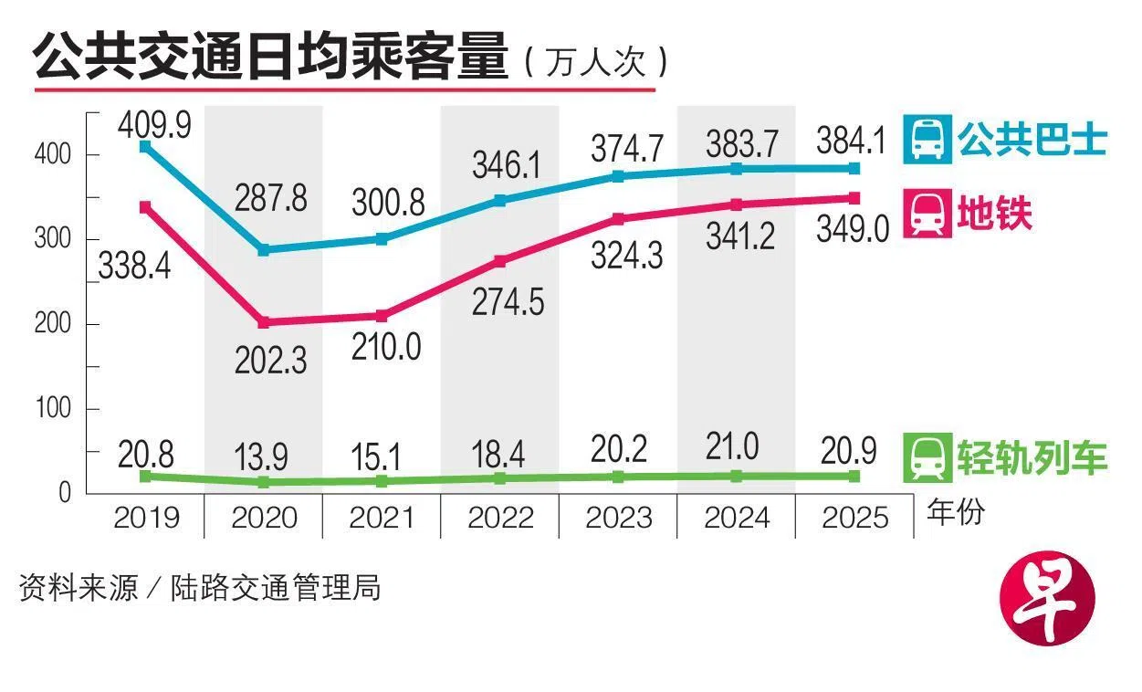 相比之下,巴士乘客量增幅较小,日均乘客量从前年的383万7000人次,微增0.1%至384万1000人次。