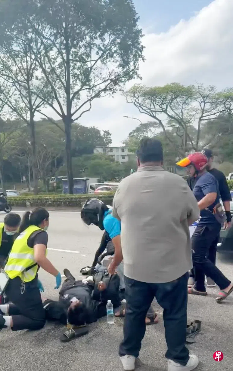 两辆汽车后方停着三辆电单车,前方路肩则停着一辆黑色电单车。一名男骑士躺在地上,头盔已摘下;数名医护人员和骑士围在他周围,为他提供救治。