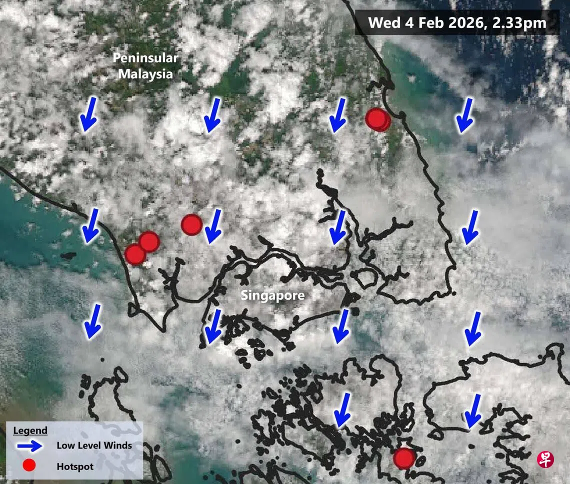 新加坡部分地区及邻近区域星期三出现阵雨,改善空气素质。尽管柔佛部分地区监测到热点,但未发现烟霾扩散迹象。