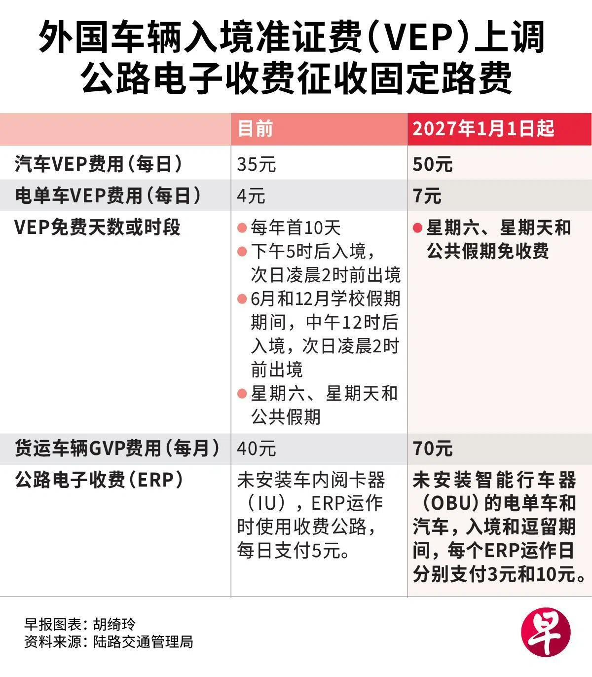 明年1月1日起,外国注册车辆入境准证费用将调高,汽车每日从35元增至50元,电单车则从4元增至7元。原有的每年10天免费入境额度和部分免费时段将取消,仅保留周末和公共假日免收费的安排。