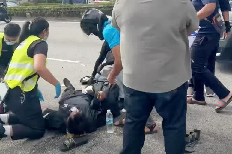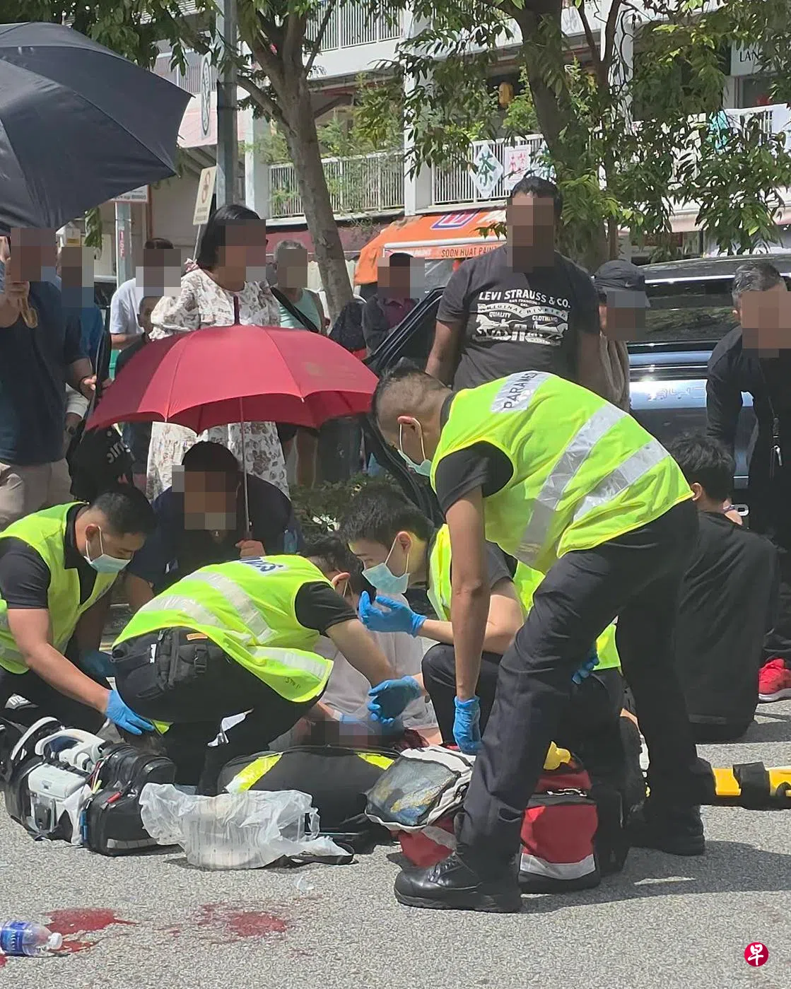 数名路人见状,纷纷围绕在伤者身旁协助照看,有些人也撑起了雨伞。马路上也留有一摊血迹。