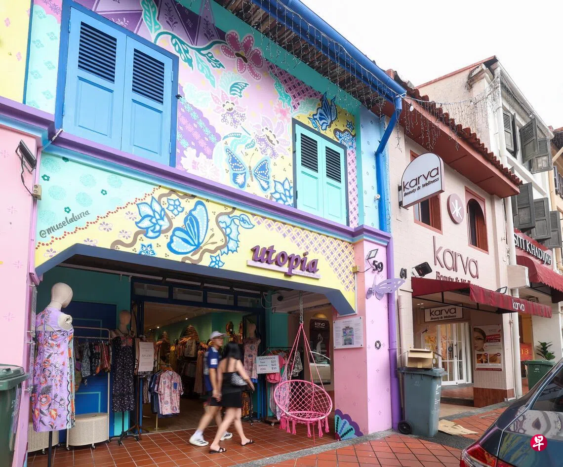 售卖蜡染服饰的Utopia Apparels曾在哈芝巷营业,2025年9月搬到59亚拉街(Arab Street)营业。这家服装店之前在哈芝巷营业时,店屋外墙也绘制类似壁画,当时获准这么做,迁入新地点后却碰壁。