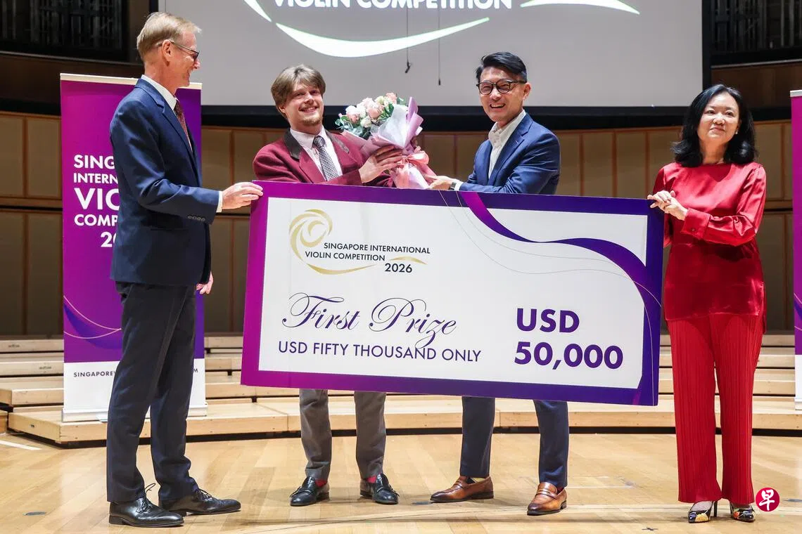 乌克兰选手乔治·莫罗兹(Georgii Moroz)星期六(2月7日)晚在滨海艺术中心音乐厅举行的第四届新加坡国际小提琴比赛总决赛中脱颖而出,荣获冠军。来自丹麦的迈克尔·格默(Michael Germer)与来自中国的邹梦分别获得第二名与第三名。