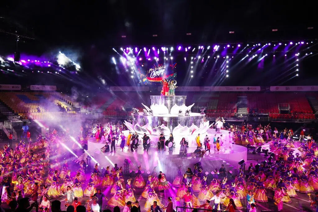 全方位圆形舞台上,四大种族的传统节庆轮番上演,来自44所中小学的逾3400名师生沉浸在妆艺游行国民教育演出中,跟随表演者载歌载舞,在星空下许愿,期盼一个多元共荣、和谐共进的未来。