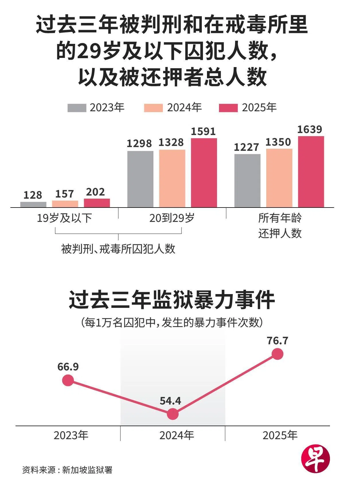 去年,被判监或在戒毒所里的19岁及以下囚犯共有202人,较2024年的157人增加近三成;2023年则有128人。20岁到29岁的囚犯人数则为1591人,比2024年的1328人增加约20%;2023年为1298人。