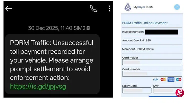 警方指出,在这类诈骗中,受害者会收到一则自称是马来西亚皇家警察(马来文简称为PDRM)的短信,称他们有未缴清的车辆过路费。短信会要求受害者点击链接进行付款,而这个链接会把受害者引导至一个钓鱼网站,并让他们输入个人资料,例如身份证号码、车牌号码、银行资料、银行卡资料等。
