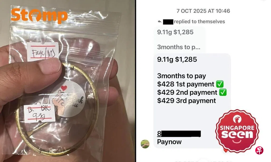 他指妻子看中的手镯为9.11克黄金,对方让他们分三期付款,第一笔数额428元已于去年9月13日通过PayNow转账,并于11月6日完成所有付款。