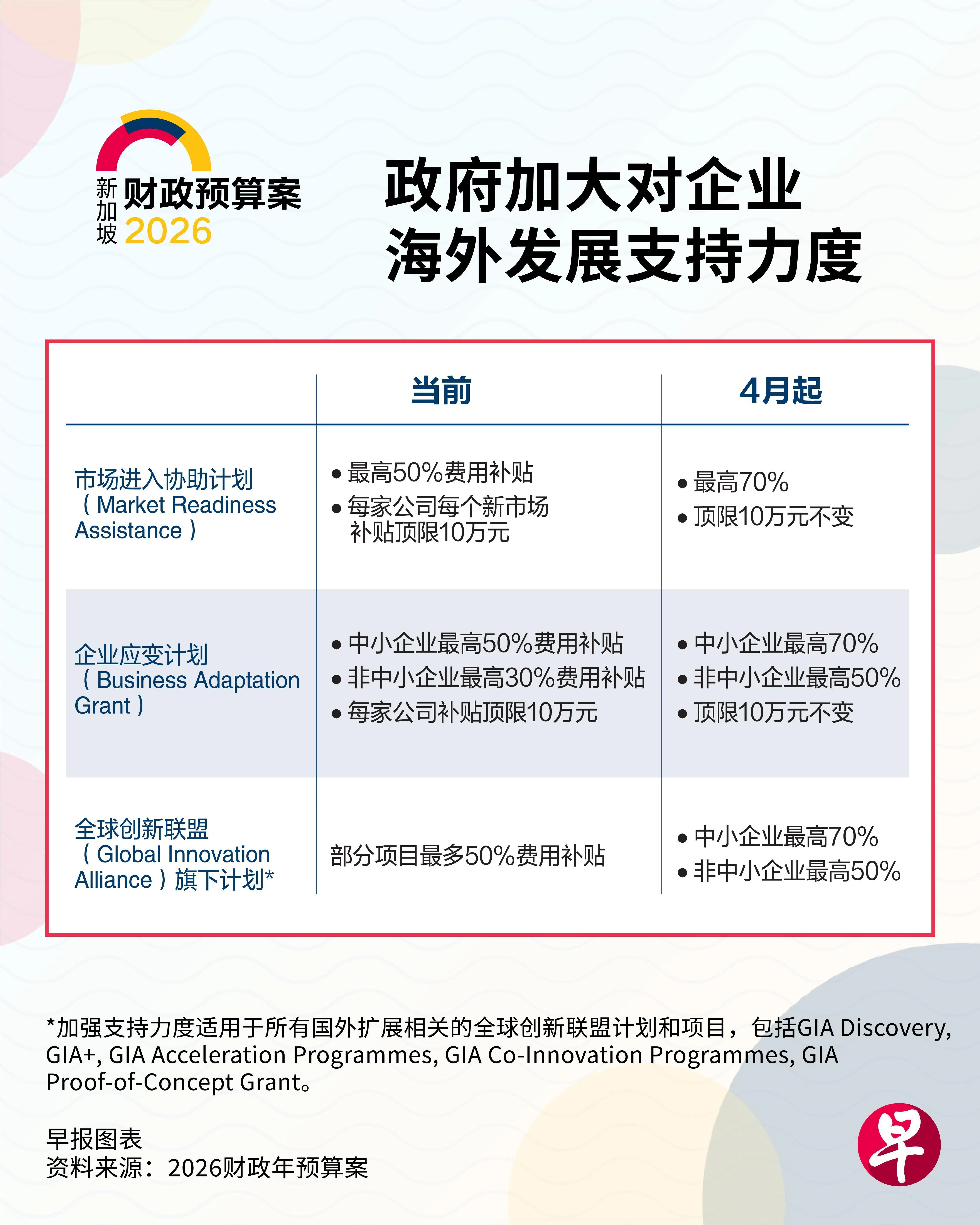 这适用于现有的企业应变计划(Business Adaptation Grant)和全球创新联盟(Global Innovation Alliance,简称GIA)下的项目。前者旨在帮助受关税影响的企业增强供应链韧性,后者聚焦协助初创企业拓展海外市场。