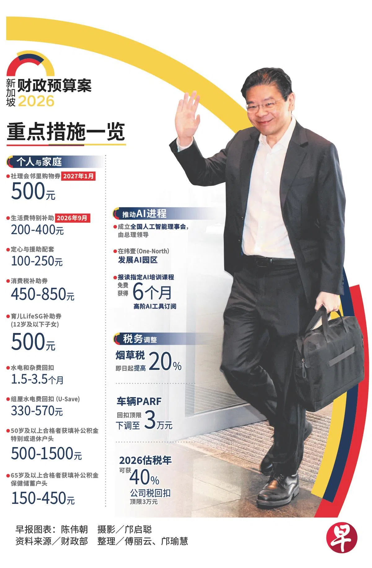 2026年财政预算案是一份惠及家庭、年长者、工人和企业的全民预算,也为我国全力推行人工智能发展、规划可持续未来、提升防卫能力,以及强化新加坡精神提供方向。