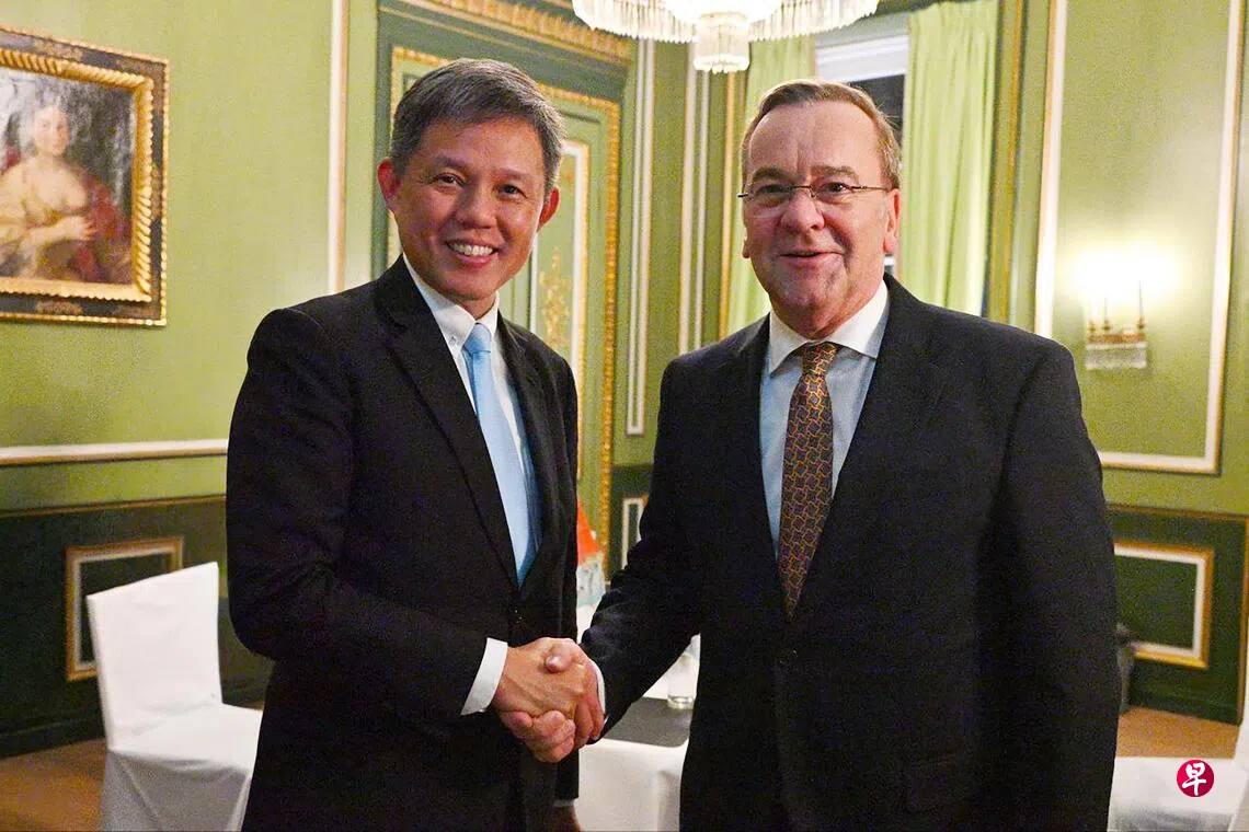 陈振声参加会议期间,也与德国国防部长皮斯托留斯(Boris Pistorius)会晤,感谢德国国防部支持新加坡武装部队在德国的训练。两国防长也重申新德两国之间牢固且实质的防务关系。