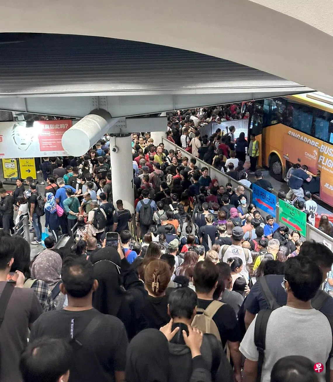 也有网民在脸书上发出星期六早上约7时通关的照片,兀兰关卡等候巴士过长堤的人龙,已经排到了出境大厅。