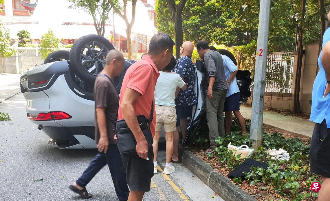 文汉说,看见汽车从新加坡佛教居士林的停车场驶出后突然失控,翻覆在路边。