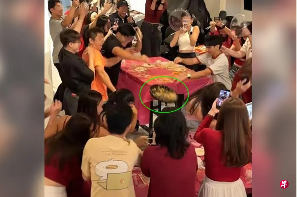有网民在2月11日上载视频,画面显示,在南洋理工大学四个宿舍联办的庆新年活动上,数百名学生聚集礼堂参与捞鱼生活动。礼堂内摆放约四张长桌,地上铺着白色塑料布,开始捞鱼生后,大家越捞越兴奋,有者将桌上的食物扔向他人,有者则将食物抛掷到空中。一些学生为闪避,举起塑料盒遮头。