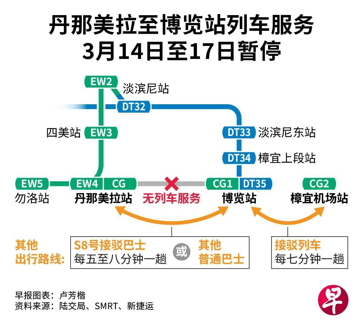 为此,往返丹那美拉站与博览站的列车服务将暂停四天。至于博览站与樟宜机场站之间的列车服务,则会在尖峰时段维持每七分钟一班。