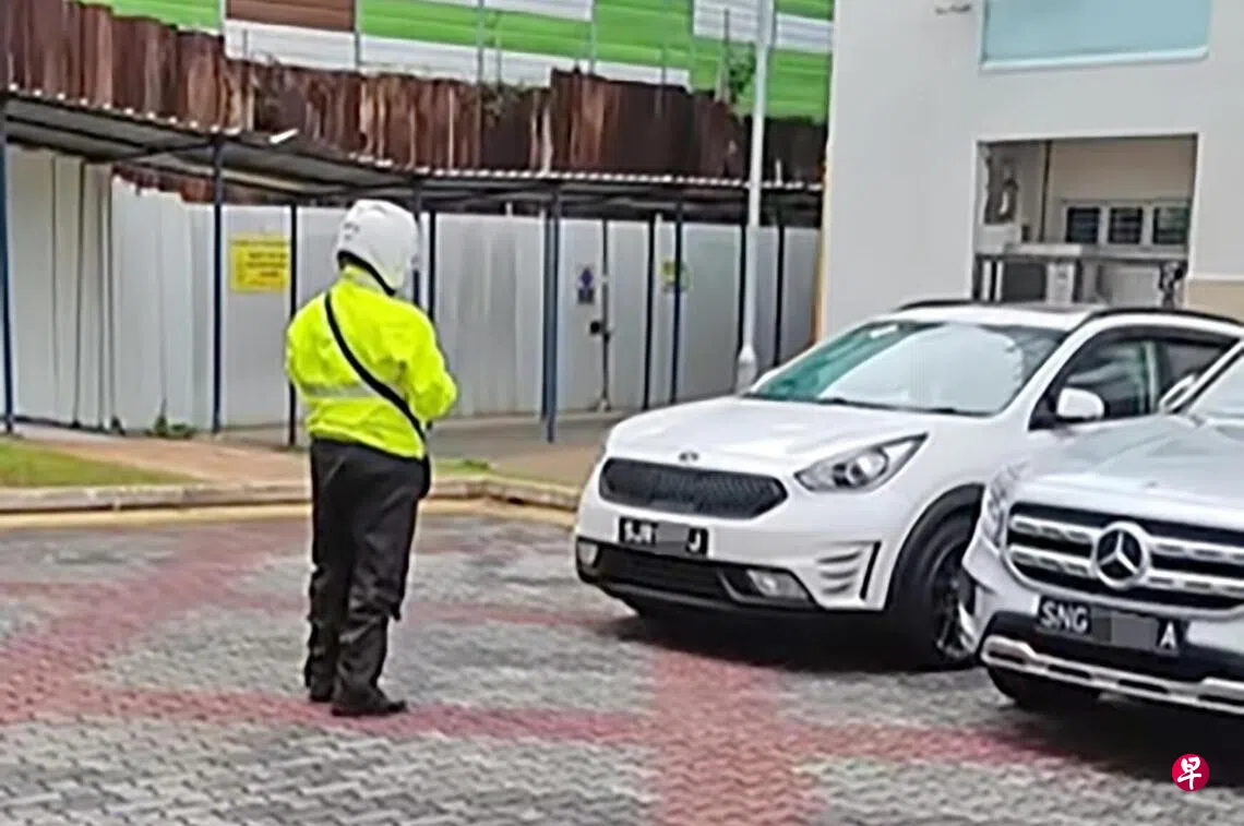 画面可见,当时组屋楼下共停着九辆轿车,稽查员正在对违规车辆开罚单。