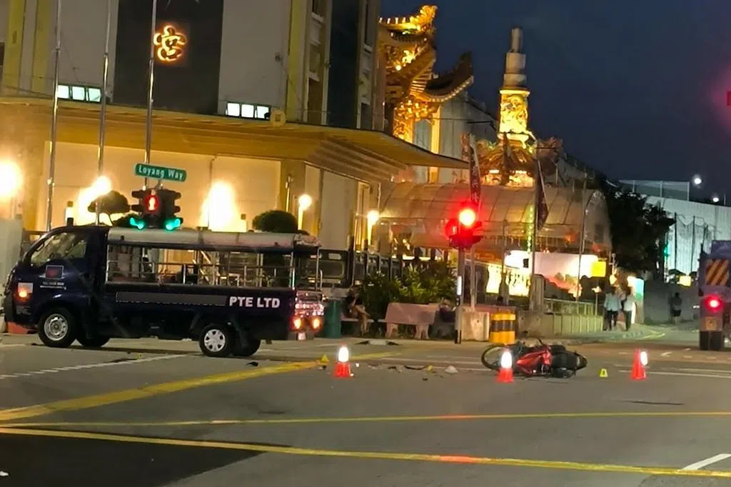 从上传照片中可见,数名警员围着一辆倒在地上的电单车,前方不远处则停有一辆倾斗罗厘。另一张照片显示,左边两条车道被交通锥封锁,现场也停有数辆警车。