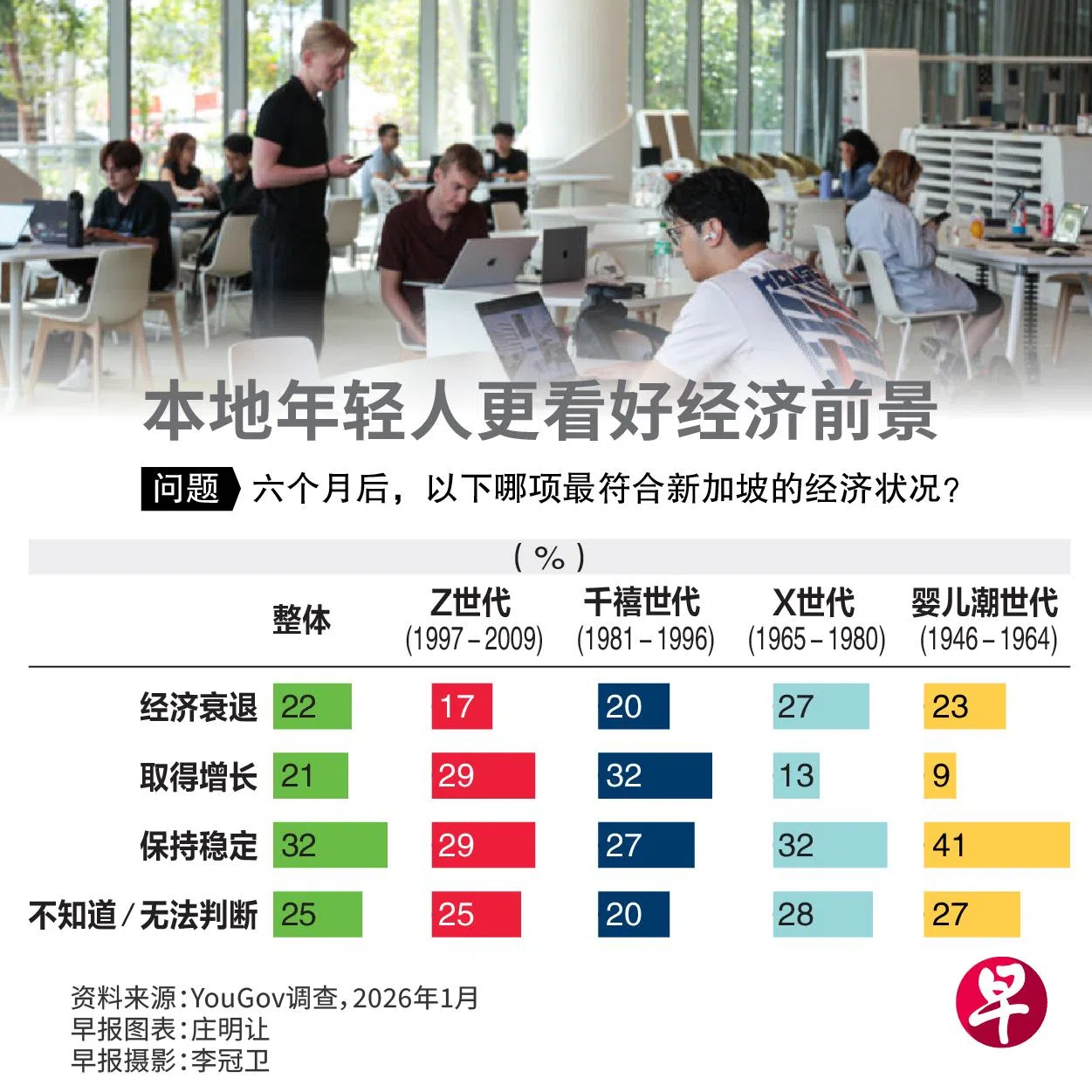 尽管多数新加坡人认为未来半年我国经济会保持稳定,本地年轻人相对乐观。最新调查显示,看好未来半年经济会增长的Z世代和千禧世代,比率明显高于年长群体,反映代际差异。