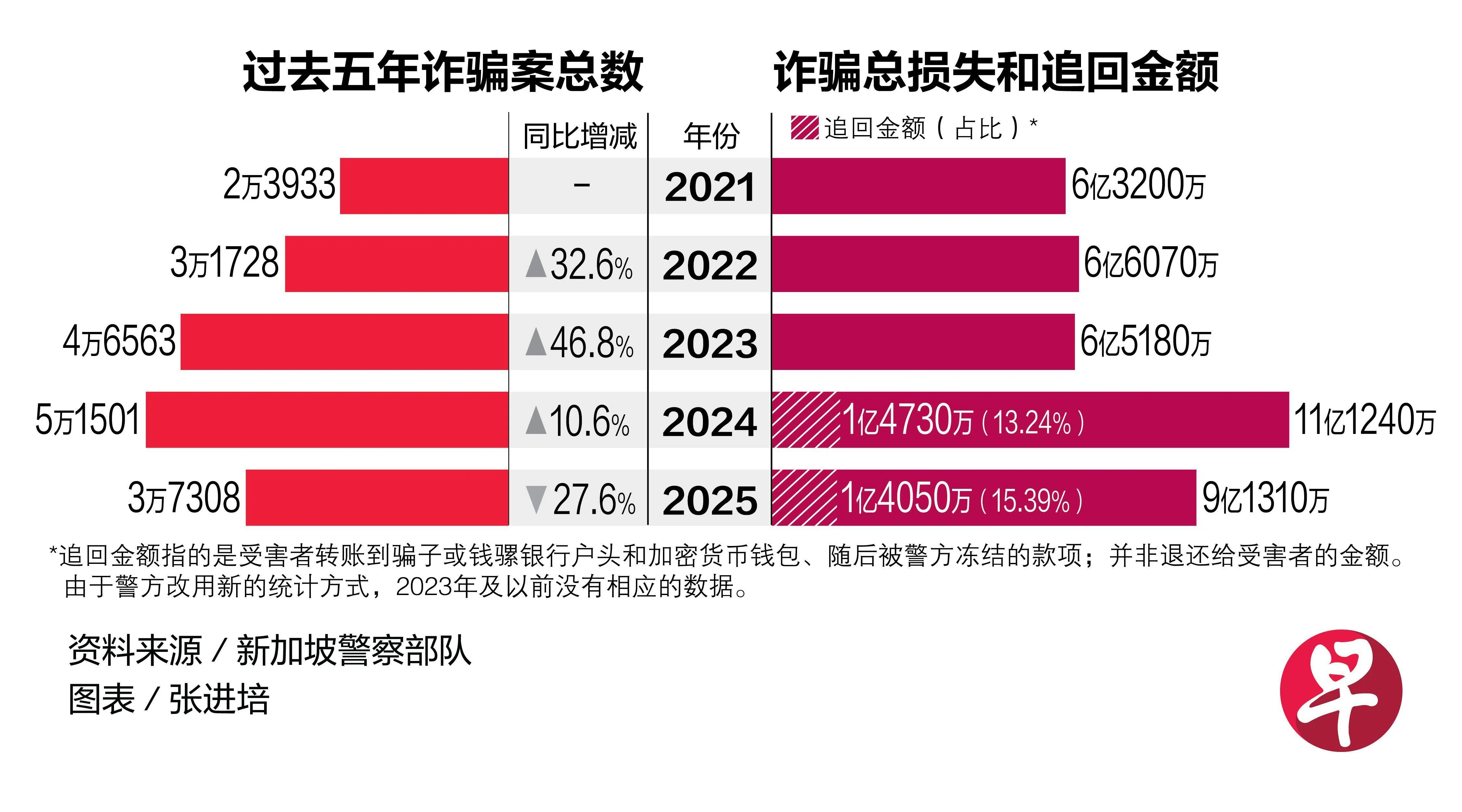 新加坡警察部队星期三(2月25日)公布2025年全年诈骗和网络犯罪数据,诈骗案数量从2024年的5万1501起,下降27.6%至去年的3万7308起;损失款项则从11亿1240万元,减少17.9%至去年的9亿1310万元。