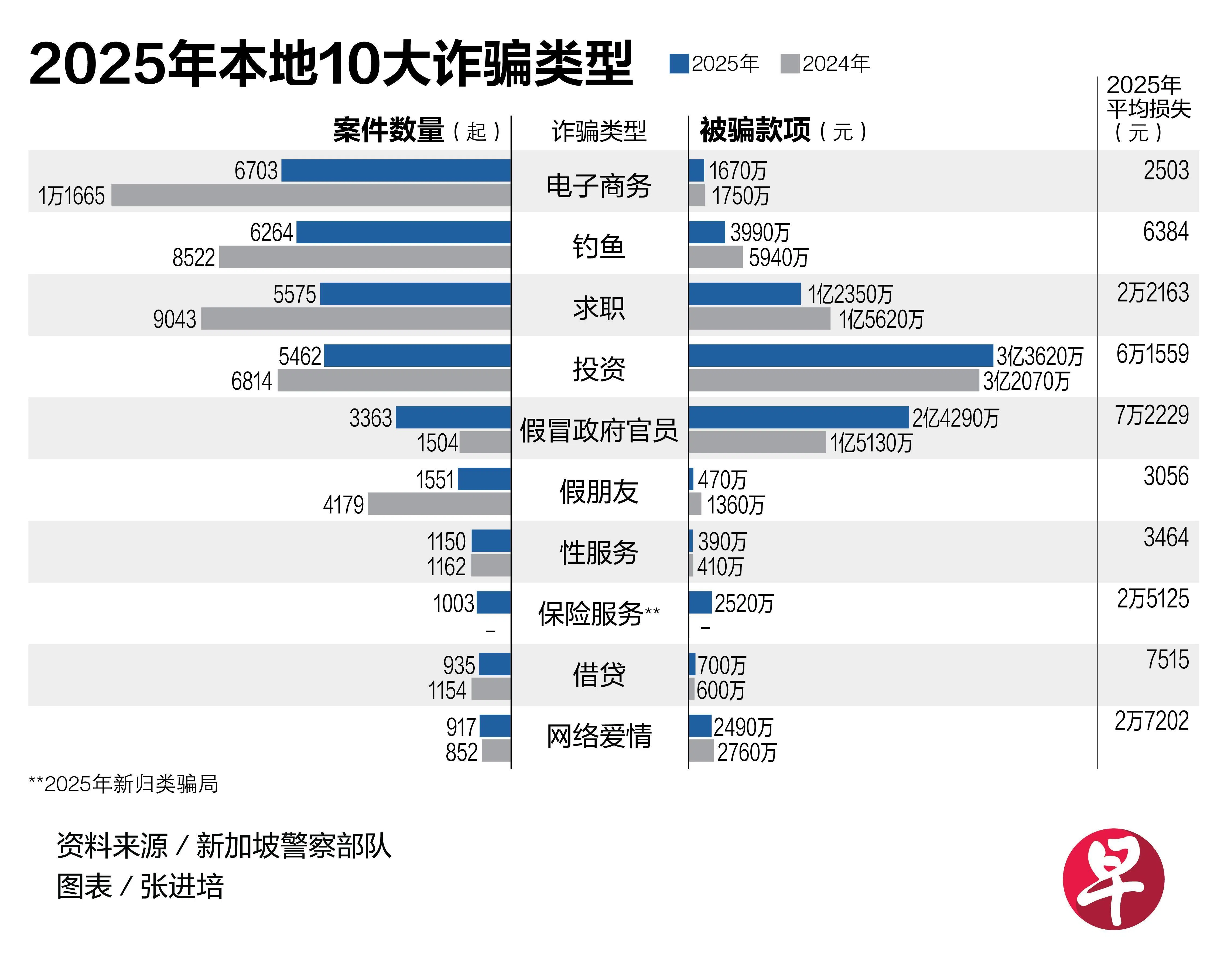去年10大类型诈骗的个别数量虽然多数下降,但冒充政府官员的骗局却翻倍增长,从2024年的1504起,猛增至去年的3363起;涉及的损失金额也从1亿5130万元上升至2亿4290万元。
