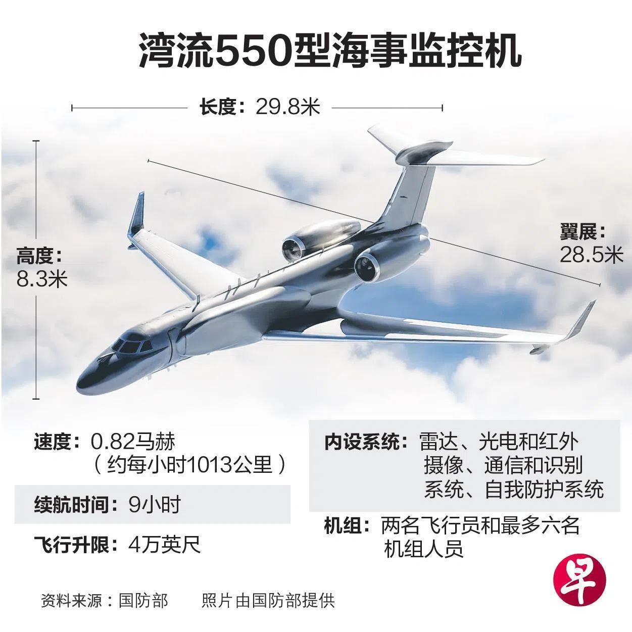 湾流海事监控机配备雷达、光电和红外摄像,以及通信和识别系统,能同时探测、识别和追踪多种潜在海上威胁。国防部没有透露这批海事监控机的具体交付时间和价格。