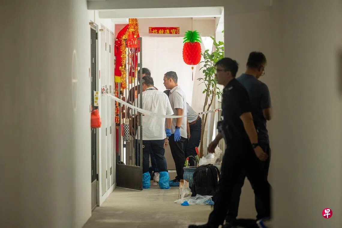 记者上午抵达现场时,警方正在封锁范围内展开调查,单位外还张贴着红色对联和一些新年装饰。据观察,数名警察驻守在单位外,事发组屋楼下则停着一辆犯罪现场调查车和两辆警车,气氛凝重。不少戴着蓝色手套和脚套的查案人员不断进出单位。