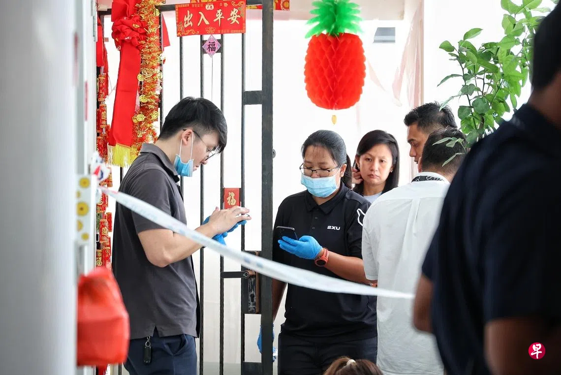 这起命案发生于星期五早上6时许,地点是北岸通道(Northshore Drive)第408B座组屋10楼一间单位。《新明日报》记者赶抵现场时,单位外已拉起封锁线,多名警员在场调查,鉴证人员频繁进出,带走好几个装有证物的塑料袋,现场气氛凝重。