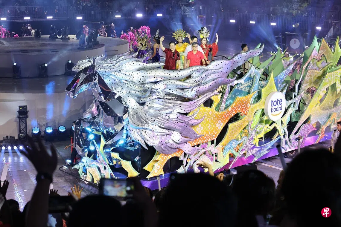 黄循财总理乘坐花车与表演者进入会场,这是他第二次以总理身份出席妆艺大游行。他在花车上向大家送上祝福:“新年快乐、心想事成、马年行大运!”总理致贺后,现场随即绽放出五彩缤纷的烟花。