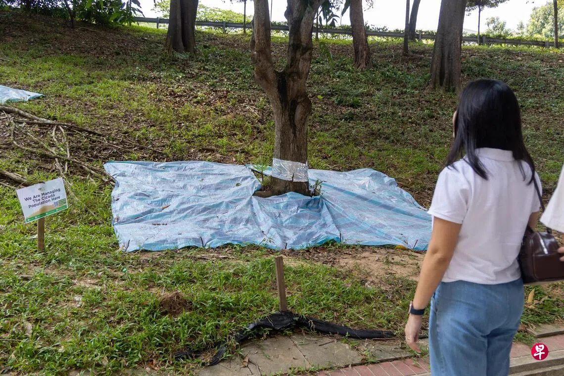 朱倍庆说,工作小组将采取两方面的措施:一是控制蝉群数量,目标恢复至2018年前的水平。具体做法包括在区内约126棵树木下铺设防水篷布(tarpaulin sheet)和椰壳垫(coconut husk mats),作为物理屏障,以阻止刚孵化的若虫(nymph)钻入地下,并防止成熟若虫钻出地面。同时,也用铝箔包裹树干,避免它们爬上树脱壳,以干扰蝉的生命周期。