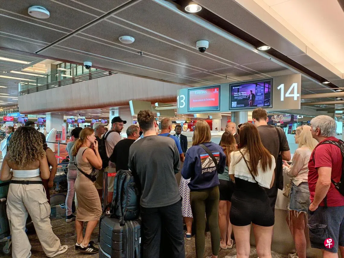 《联合早报》读者提供的照片显示,星期天中午12时30分许,第一搭客大厦的阿联酋航空公司柜台前聚集了约30名乘客,正焦急地向工作人员查询情况。