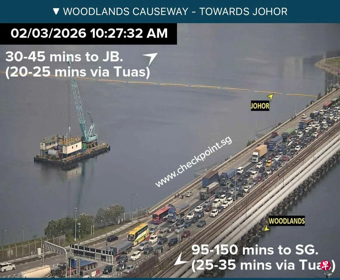 根据Checkpoint.sg应用的路况,星期一早上10时半许,从兀兰关卡入境我国的通关时间预计最高达150分钟,大士和兀兰关卡的桥上都可见长长车龙。