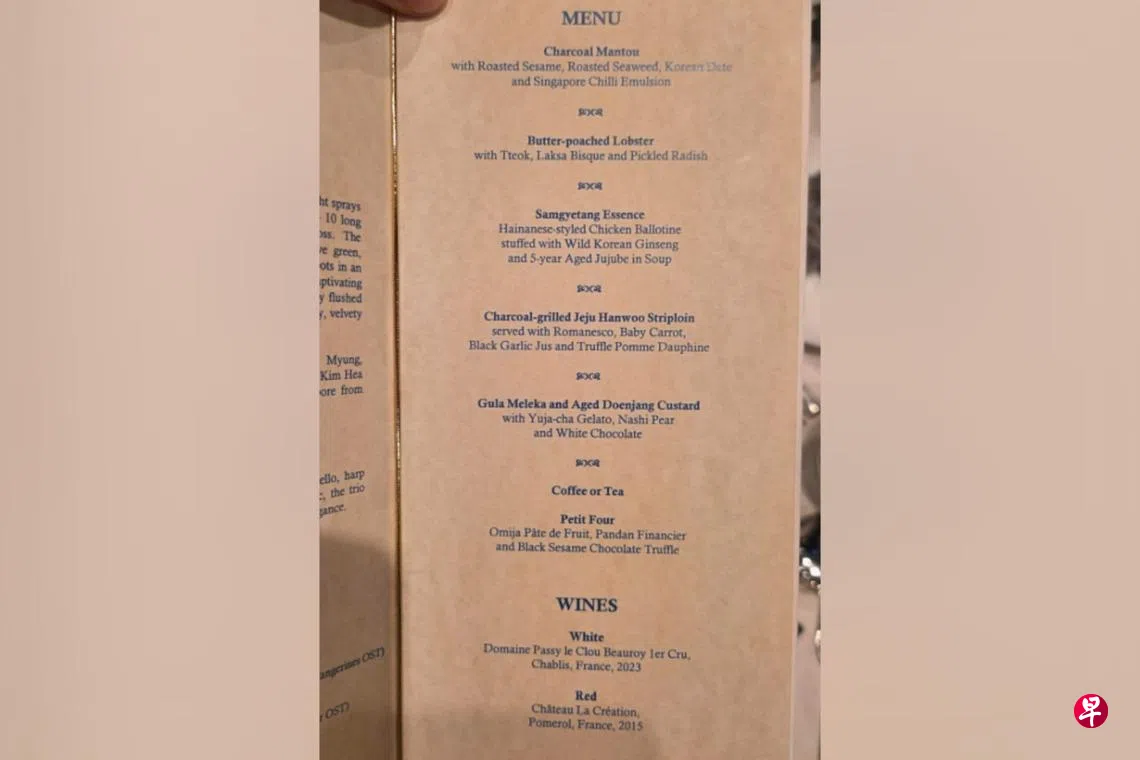 尚达曼总统国宴款待李在明伉俪 呈献新韩融合美食精心设计的国宴菜单上共有六道菜肴,选材和烹饪手法均可见厨师将新加坡南洋风味与韩国元素相结合的巧思。今年1月刚获准进入本地的韩国牛肉、韩国人参鸡汤、加入叻沙口味的龙虾汤和椰糖制成的甜点等融合新韩风味的美食,都是星期一(3月2日)晚上招待韩国李在明总统的国宴桌上佳肴。 李在明应尚达曼总统邀请,星期天(1日)对新加坡展开三天国事访问。尚达曼总统与夫人珍一藤木也在星期一晚特地设国宴款待李在明伉俪。 精心设计的国宴菜单上共有六道菜肴,选材和烹饪手法均可见厨师将新加坡南洋风味与韩国元素相结合的巧思。 延伸阅读 新胡姬花品种 以李在明伉俪命名 新韩领导人盼中东地区尽快恢复和平稳定 国事访问李在明尚达曼上一篇更多年轻人因商业罪行被捕 本地年轻罪犯总数增超过三成下一篇未来两周下午多雷阵雨 最高气温35摄氏度购买此文章