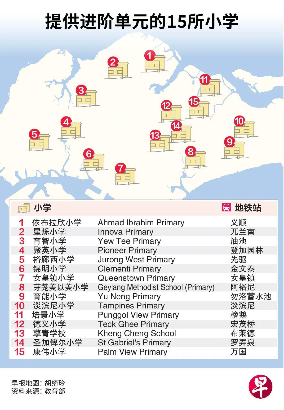 作为指定中心的15所小学分布全岛各区,有公共交通直达。今年的小三学生将在8月参加统一评估测试,选出参加校本增益项目和修读进阶单元的学生。校方也可通过其他途径,如教师推荐、学生平时课业表现等来识别和推荐有潜力的学生。