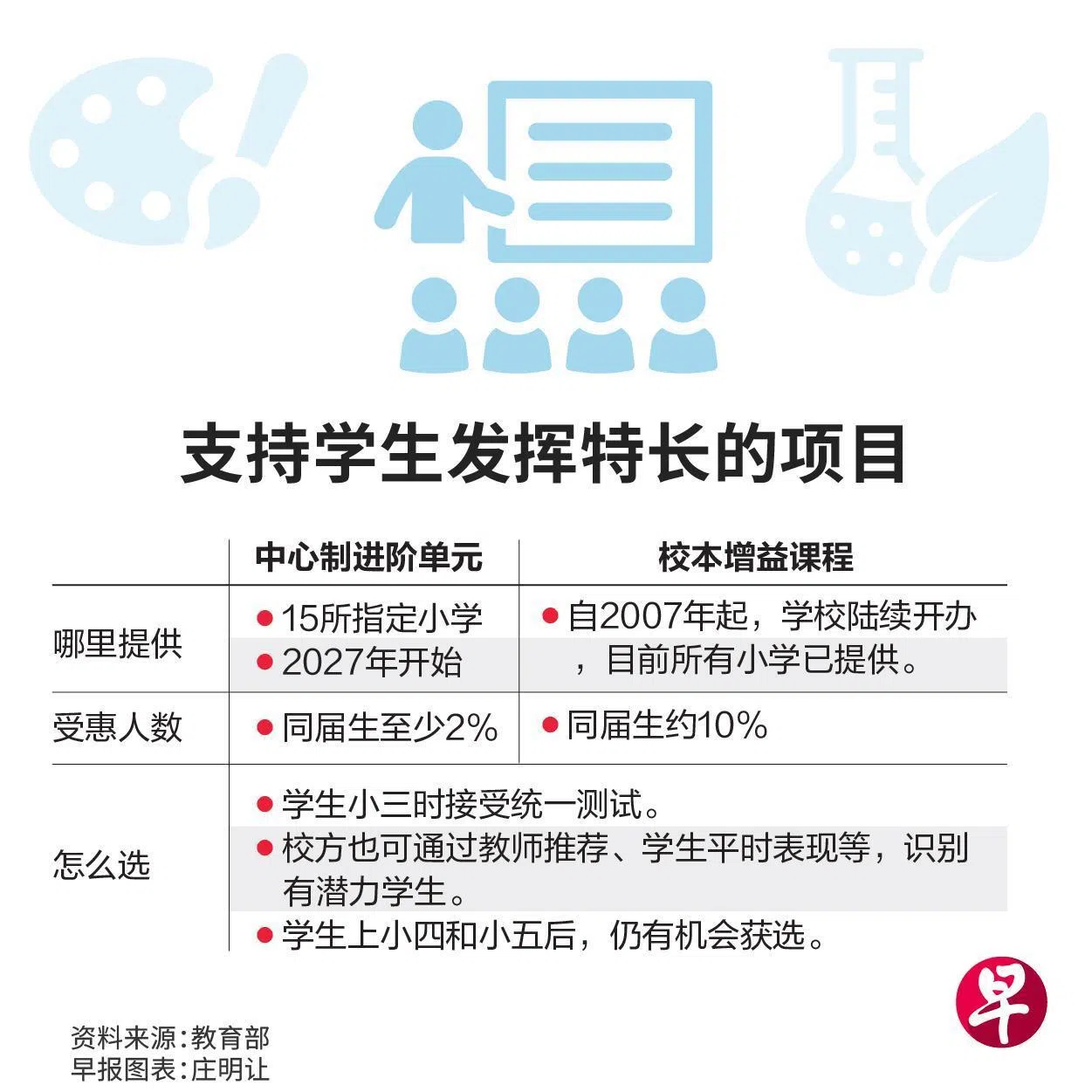 教育部受询时指出,负责教导进阶单元的教师隶属教育部总部,这些教师会到不同指定中心的小学教进阶单元,他们不属于指定中心学校的师资。