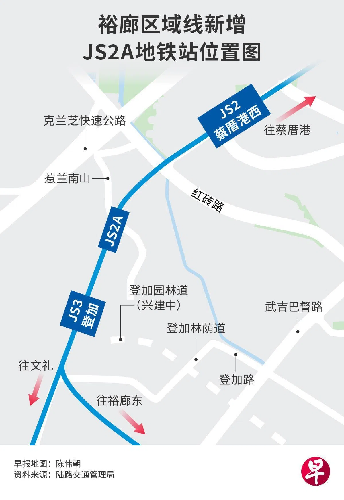 交通部代部长兼财政部高级政务部长萧振祥星期三(3月4日)在国会拨款委员会辩论交通部开支预算时宣布,陆路交通管理局将在登加为裕廊区域线(Jurong Region Line,简称裕廊线)增建一个新地铁站,暂名为JS2A站,使地铁站总数增至25个。