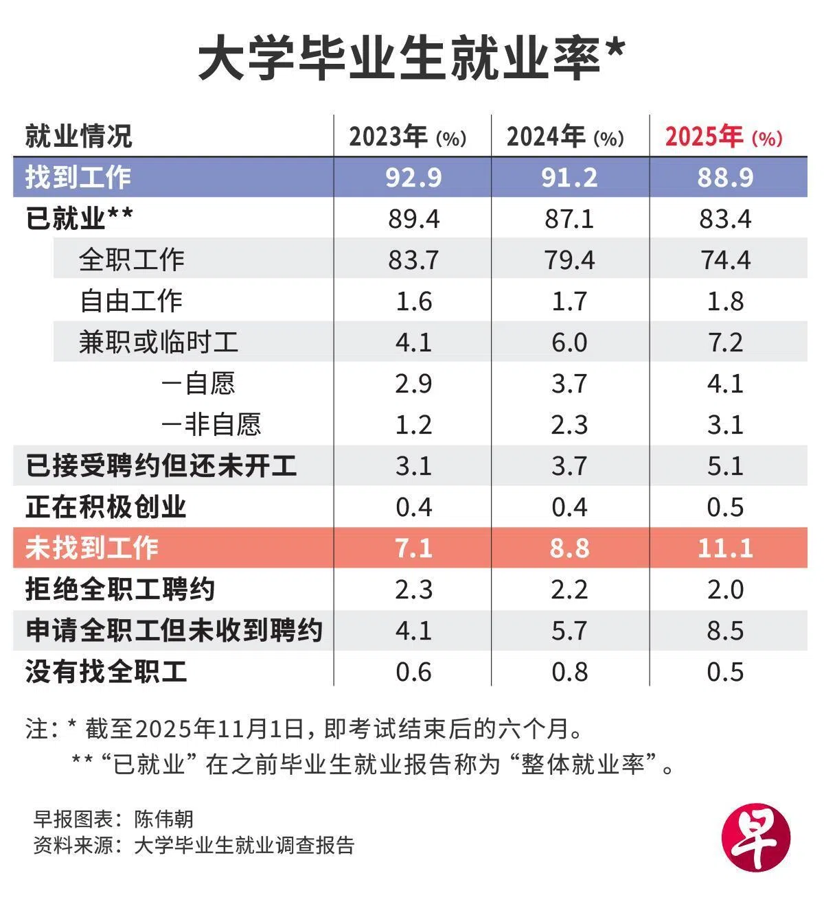 调查显示,在最后考试结束后的六个月,即截至2025年11月1日,有88.9%的毕业生找到工作,比前一年低2.3个百分点。