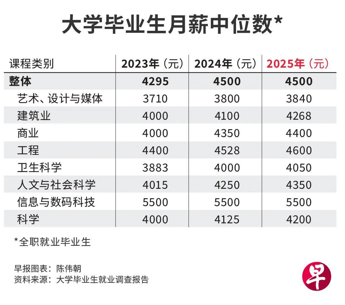 由于经济前景不稳定和招聘需求疲软,本地应届大学毕业生的就业率持续下降,全职就业率跌至74.4%,比前一年低五个百分点。不过,整体起薪没有变化,月薪中位数仍然维持在4500元。