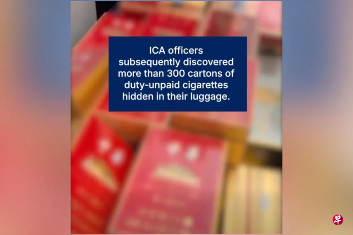 移民局人员在彻查他们的行李后发现,里头藏有超过300条漏税香烟。 (取自移民与关卡局脸书)