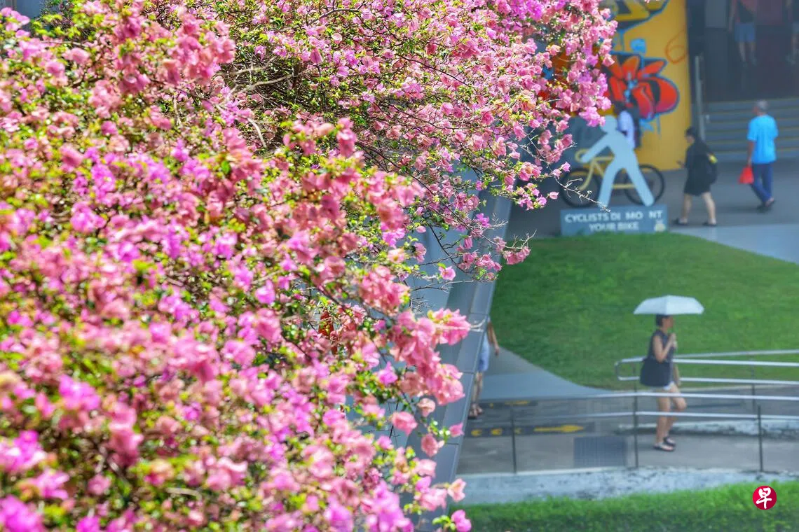 近日,在新加坡的街头巷尾,不少枝头上的花朵争相绽放,红的像火、粉的像霞,为新加坡带来了一丝春日的气息。