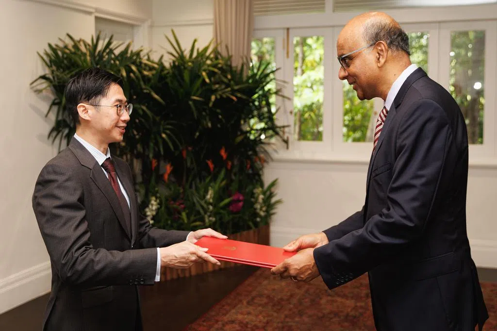 邢益耀和张丽清在星期二从尚达曼总统手中接过委任状。