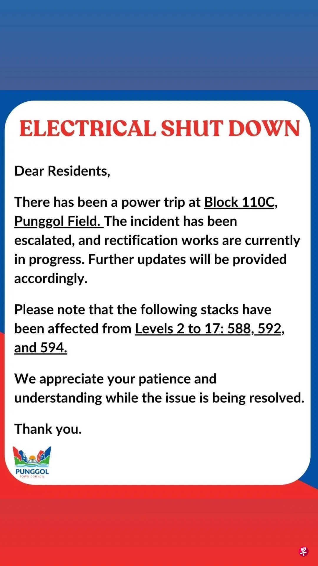 榜鹅市镇理事会星期二(3月10日)晚上10时许在社交媒体发文说,榜鹅场(Punggol Field)第110C座组屋发生电力跳闸事故,相关情况已上报处理,目前当局正在进行维修工作,后续将适时提供事件的最新进展。