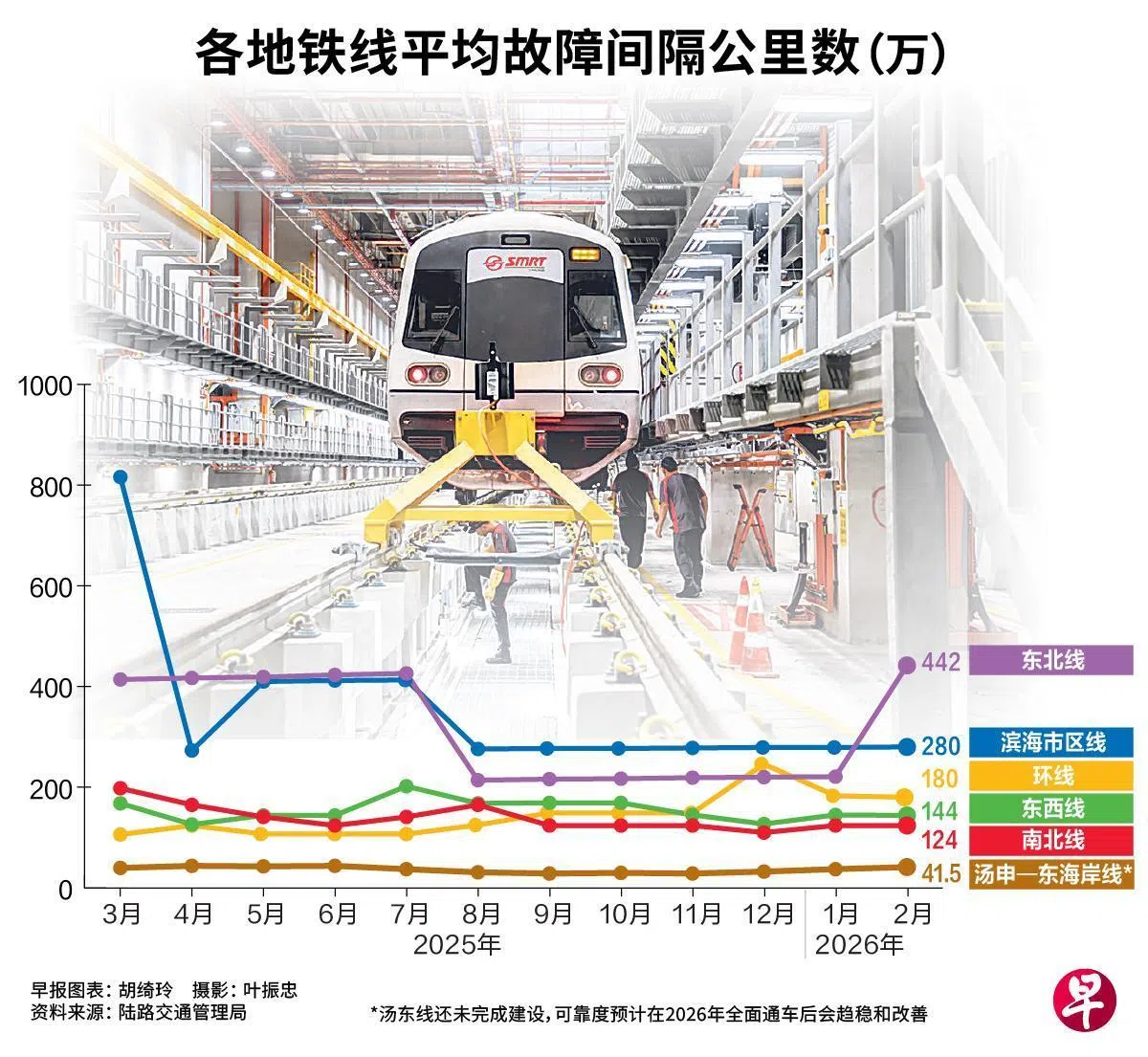SMRT经营的东西线可靠度则有所下滑,平均故障间隔公里数从1月的145万公里下滑至2月的144万公里;环线也从1月的183万公里,下滑至2月的180万公里;南北线的表现持平,维持在124万公里。