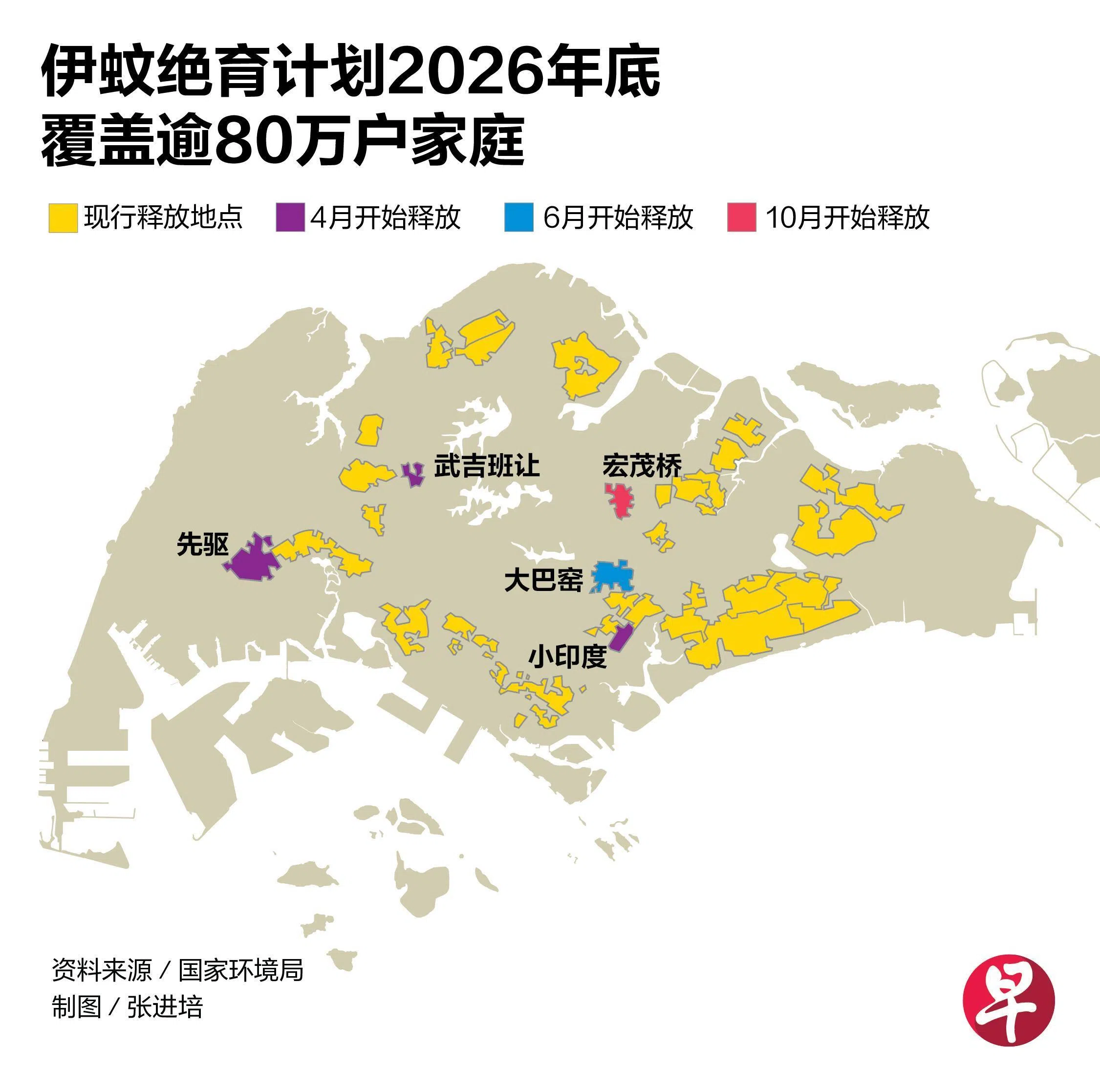 伊蚊绝育计划将在今年4月至10月,进一步扩展至武吉班让、宏茂桥等五个新地区,涵盖约10万户家庭;今年底有望覆盖新加坡全岛半数家庭逾80万户人家。