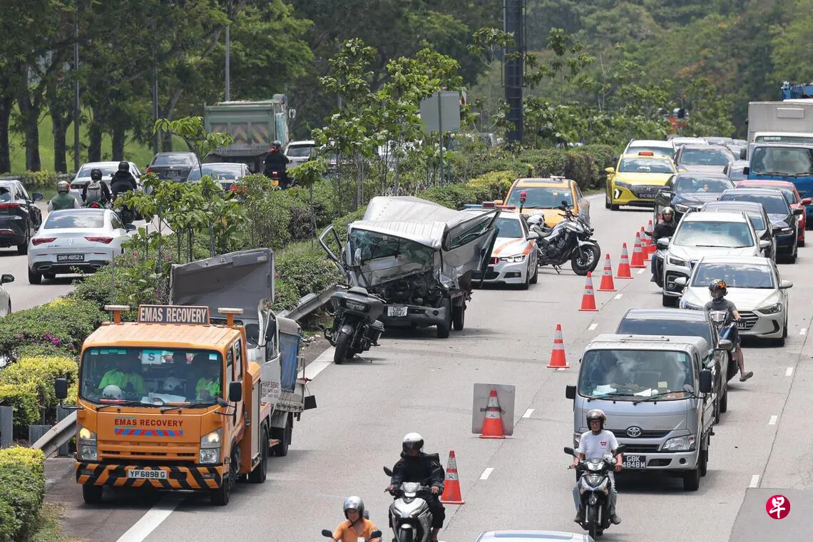 《联合早报》摄影记者下午约1时抵达现场时,涉事大型罗厘和电单车都已被移走,两辆小型罗厘则已被移到最右侧车道,拖车已在现场作业。