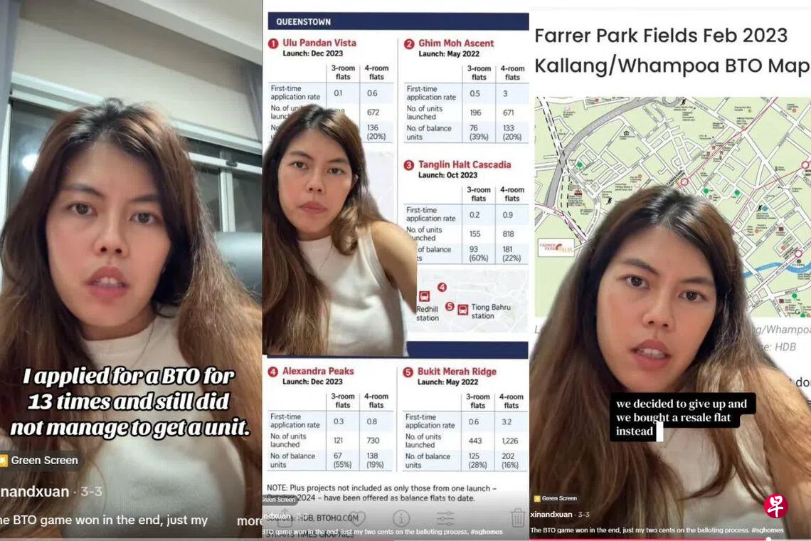 这名网名为“xinandxuan”的女子日前在TikTok发布视频称,她在过去几年共申请了13次预购组屋(BTO)项目,但申请结果往往显示需求远超供应,因此始终未能成功买房。她也质疑,一些预购组屋项目后来出现剩余单位,为何没有开放给排在队列较后的申请者挑选,而是通过剩余组屋销售活动重新推出。