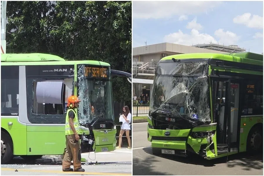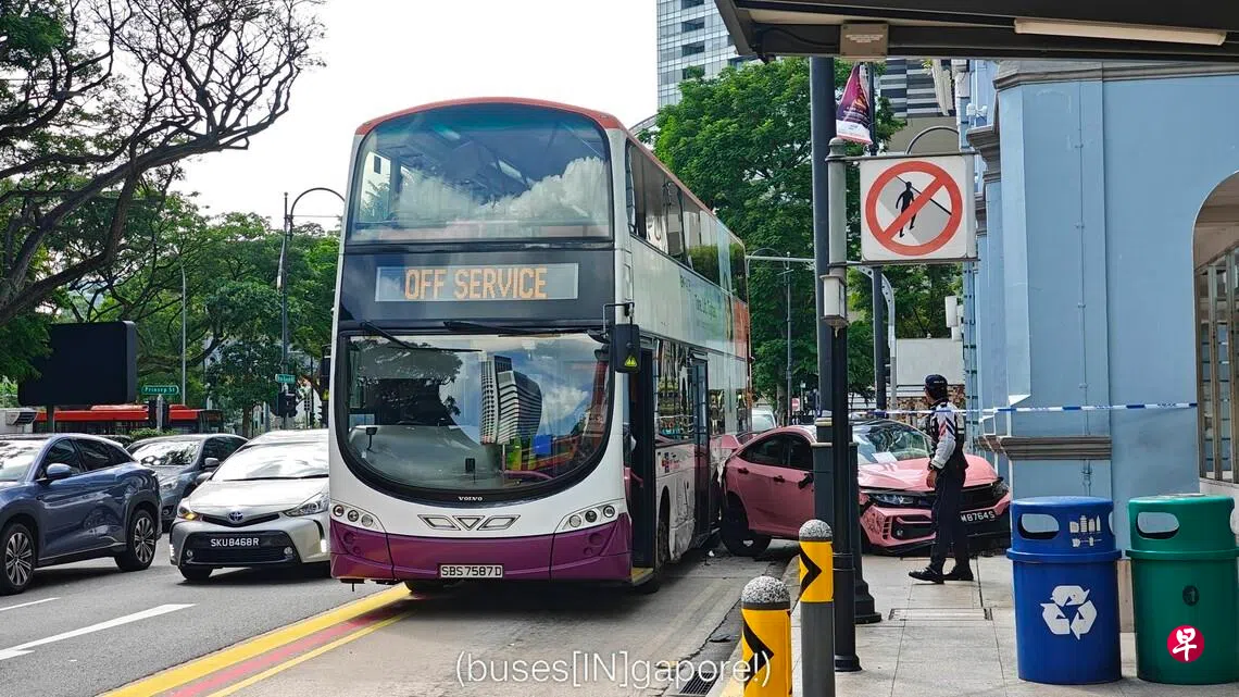 根据脸书页面(buses[IN]gapore!)星期一(3月16日)下午上传的事发照片,一辆粉色汽车看似与一辆新捷运巴士发生擦撞,汽车之后冲上路提,撞上了路旁建筑的柱子。