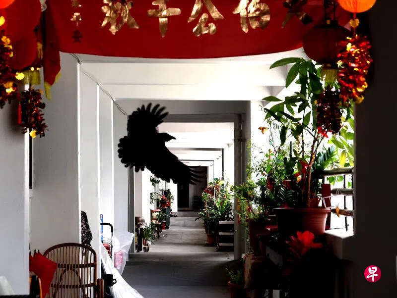 记者星期一(16日)傍晚走访这座组屋六楼时,发现一对乌鸦在一棵约五层楼高的树上栖息,并不时飞到第750座与751座组屋六楼走廊的栏杆上,上面还有不少鸟粪。