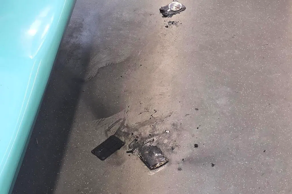 据记者观察,失火的杂物堆中有不少烧毁的纸箱、塑料瓶和疑似废弃电器外壳的铁皮残骸。篱笆另一端的大楼范围内也散落着电子面板的碎片,相信是在爆炸发生时被震飞过去的。
